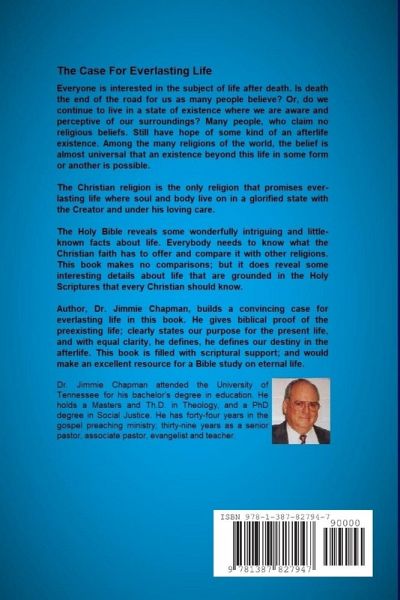 Is death the end of the road for us as many people believe? Or do we continue to live in a state of existence where we are aware and perceptive of our surroundings? Christianity is the only religion that promises mankind hope for everlasting life where the soul and body live on in a glorified state; with the Creator and under his loving care. The Holy Bible reveals some wonderfully intriguing and little-known facts about life. Author, Dr. Jimmie Chapman builds a convincing case for everlasting life in this book. He gives biblical proof of the preexisting life, clearly states our purpose for the present life and with equal clarity he defines our destiny in the afterlife. This book is filled with scriptural support and would make an excellent resource for a Bible study on everlasting life.