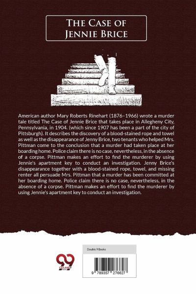 American author Mary Roberts Rinehart (1876-1966) wrote a murder tale titled The Case of Jennie Brice that takes place in Allegheny City, Pennsylvania, in 1904. (which since 1907 has been a part of the city of Pittsburgh). It describes the discovery of a blood-stained rope and towel as well as the disappearance of Jenny Brice, two tenants who helped Mrs. Pittman come to the conclusion that a murder had taken place at her boarding home. Police claim there is no case, nevertheless, in the absence of a corpse. Pittman makes an effort to find the murderer by using Jennie's apartment key to conduct an investigation. Jenny Brice's disappearance together with a blood-stained rope, towel, and missing renter all persuade Mrs. Pittman that a murder has been committed at her boarding home. Police claim there is no case, nevertheless, in the absence of a corpse. Pittman makes an effort to find the murderer by using Jennie's apartment key to conduct an investigation.