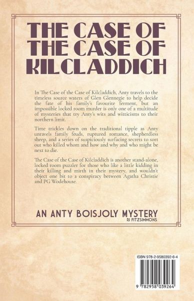 In The Case of the Case of Kilcladdich, Anty travels to the timeless source waters of Glen Glennegie to help decide the fate of his family's favourite ferment, but an impossible locked room murder is only one of a multitude of mysteries that try Anty's wits and witticisms to their northern limit. Time trickles down on the traditional tipple as Anty unravels family feuds, ruptured romance, shepherdless sheep, and a series of suspiciously surfacing secrets to sort out who killed whom and how and why and who might be next to die. The Case of the Case of Kilcladdich is another stand-alone, locked room puzzler for those who like a little kidding in their killing and mirth in their mystery, and wouldn't object one bit to a conspiracy between Agatha Christie and PG Wodehouse.