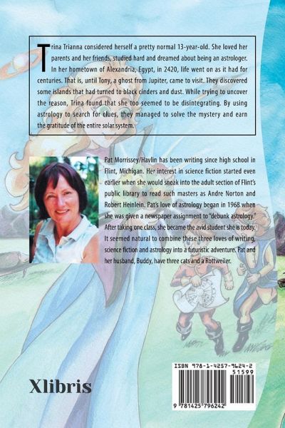 A science fiction, mystery adventure for the young adult Trina Trianna considered herself a pretty normal 13-year-old. She loved her parents (most of the time), loved her friends (most of the time), studied hard (some of the time) and dreamed about being an astrologer (absolutely all of the time)! In her hometown of Alexandria, Egypt, in the Year 2433, life went on pretty much as it had for centuries. Sure, Trina used a hologram projection of herself to "try on" her clothes to find just the right outfit. And she had her very own robot to tutor her in astrology. But, over all, her life was quite unexciting. That is, until Tony, a ghost from Jupiter, came to visit. Once Tony arrived, things started happening. They discovered a place where the earth seemed to be disintegrating. While trying to uncover the reason, Trina found that she too seemed to be disintegrating. When her mom took her to the doctor, she learned that a very cute - but notoriously stuck up - young aristocrat named Ethan had the same problem she did. While following the trail of the mystery, Trina, Tony and Ethan met a gigantic crystal that talked, flew a jet helicopter into restricted air space, and got tied up in a cave and left for dead. By using astrology to search for clues, they managed to solve the mystery and earn the gratitude of the entire solar system.