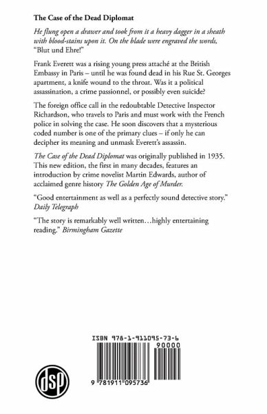He flung open a drawer and took from it a heavy dagger in a sheath with blood-stains upon it. On the blade were engraved the words, "Blut und Ehre!" Frank Everett was a rising young press attaché at the British Embassy in Paris - until he was found dead in his Rue St. Georges apartment, a knife wound to the throat. Was it a political assassination, a crime passionnel, or possibly even suicide? The foreign office call in the redoubtable Detective Inspector Richardson, who travels to Paris and must work with the French police in solving the case. He soon discovers that a mysterious coded number is one of the primary clues - if only he can decipher its meaning and unmask Everett's assassin. The Case of the Dead Diplomat was originally published in 1935. This new edition, the first in over seventy years, features an introduction by crime novelist Martin Edwards, author of acclaimed genre history The Golden Age of Murder. "Good entertainment as well as a perfectly sound detective story." Daily Telegraph "The story is remarkably well written…highly entertaining reading." Birmingham Gazette