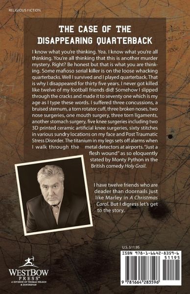 I know what you're thinking. Yea. I know what you're all thinking. You're all thinking that this is another murder mystery. Right? Be honest but that is what you are thinking. Some mafioso serial killer is on the loose whacking quarterbacks. Well I survived and I played quarterback. That is why I disappeared for thirty five years. I never got killed like twelve of my football friends did! Somehow I slipped through the cracks and made it to seventy one which is my age as I type these words. I suffered three concussions, a bruised sternum, a torn rotator cuff, three broken noses, two nose surgeries, one mouth surgery, three torn ligaments, another stomach surgery, five knee surgeries including two 3D printed ceramic artificial knee surgeries, sixty stitches in various sundry locations on my face and Post Traumatic Stress Disorder. The titanium in my legs sets off alarms when I walk through the metal detectors at airports. "Just a flesh wound" as so eloquently stated by Monty Python in the British comedy Holy Grail. I have twelve friends who are deader than doornails just like Marley in A Christmas Carol. But I digress let's get to the story.