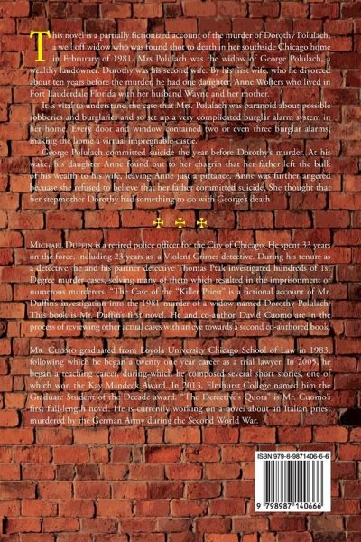 This novel is a partially fictionized account of the murder of Dorothy Polulach, a well off widow who was found shot to death in her southside Chicago home in Februrary of 1981. Mrs Polulach was the widow of George Polulach, a wealthy landowner. Dorothy was his second wife. By his first wife, who he divorced about ten years before the murder, he had one daughter, Anne Wolters who lived in Fort Lauderdale Florida with her husband Wayne and her mother. It is vital to understand the case that Mrs. Polulach was paranoid about possible robberies and burglaries and so set up a very complicated burglar alarm system in her home. Every door and window contained two or even three burglar alarms, making the home a virtual impregnable castle. George Polulach committed suicide the year before Dorothy's murder. At his wake, his daughter Anne found out to her chagrin that her father left the bulk of his wealth to his wife, leaving Anne just a pittance. Anne was further angered because she refused to believe that her father committed suicide. She thought that her stepmother Dorothy had something to do with George's death. Michael Duffin is a retired police officer for the City of Chicago. He spent 33 years on the force, including 23 years as a Violent Crimes detective. During his tenure as a detective, he and his partner detective Thomas Ptak investigated hundreds of 1st Degree murder cases, solving many of them which resulted in the imprisonment of numerous murderers. "The Case of the "Killer Priest" is a fictional account of Mr. Duffin's investigation into the 1981 murder of a widow named Dorothy Polulach. This book is Mr. Duffin's first novel. He and co-author David Cuomo are in the process of reviewing other actual cases with an eye towards a second co-authored book. Mr. Cuomo graduated from Loyola University Chicago School of Law in 1983, following which he began a twenty one year career as a trial lawyer. In 2005, he began a teaching career, during which he composed several short stories, one of which won the Kay Mandeck Award. In 2013, Elmhurst College named him the Graduate Student of the Decade award. "The Detective's Quota" is Mr. Cuomo's first full-length novel. He is currently working on a novel about an Italian priest murdered by the German Army during the Second World War.