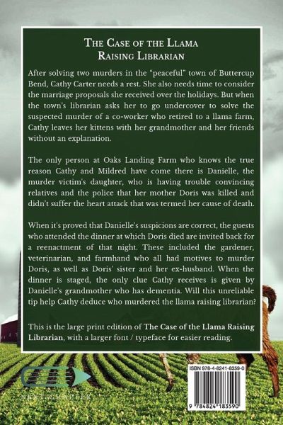After solving two murders in the "peaceful" town of Buttercup Bend, Cathy Carter needs a rest. She also needs time to consider the marriage proposals she received over the holidays. But when the town's librarian asks her to go undercover to solve the suspected murder of a co-worker who retired to a llama farm, Cathy leaves her kittens with her grandmother and her friends without an explanation. The only person at Oaks Landing Farm who knows the true reason Cathy and Mildred have come there is Danielle, the murder victim's daughter, who is having trouble convincing relatives and the police that her mother Doris was killed and didn't suffer the heart attack that was termed her cause of death. When it's proved that Danielle's suspicions are correct, the guests who attended the dinner at which Doris died are invited back for a reenactment of that night. These included the gardener, veterinarian, and farmhand who all had motives to murder Doris, as well as Doris' sister and her ex-husband. When the dinner is staged, the only clue Cathy receives is given by Danielle's grandmother who has dementia. Will this unreliable tip help Cathy deduce who murdered the llama raising librarian? This is the large print edition of The Case of the Llama Raising Librarian, with a larger font / typeface for easier reading.