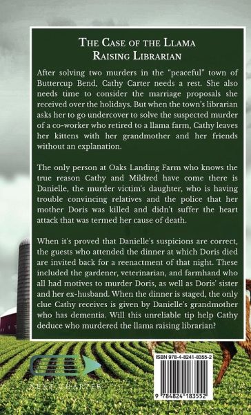 After solving two murders in the "peaceful" town of Buttercup Bend, Cathy Carter needs a rest. She also needs time to consider the marriage proposals she received over the holidays. But when the town's librarian asks her to go undercover to solve the suspected murder of a co-worker who retired to a llama farm, Cathy leaves her kittens with her grandmother and her friends without an explanation. The only person at Oaks Landing Farm who knows the true reason Cathy and Mildred have come there is Danielle, the murder victim's daughter, who is having trouble convincing relatives and the police that her mother Doris was killed and didn't suffer the heart attack that was termed her cause of death. When it's proved that Danielle's suspicions are correct, the guests who attended the dinner at which Doris died are invited back for a reenactment of that night. These included the gardener, veterinarian, and farmhand who all had motives to murder Doris, as well as Doris' sister and her ex-husband. When the dinner is staged, the only clue Cathy receives is given by Danielle's grandmother who has dementia. Will this unreliable tip help Cathy deduce who murdered the llama raising librarian?
