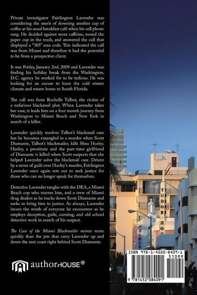 Private investigator Fairlington Lavender was considering the merit of downing another cup of coffee at his usual breakfast café when his cell phone rang. He decided against more caffeine, tossed the paper cup in the trash, and answered the call that displayed a "305" area code. This indicated the call was from Miami and therefore it had the potential to be from a prospective client. It was Friday, January 2nd, 2009 and Lavender was finding his holiday break from the Washington, D.C. agency he worked for to be tedious. He was looking for an excuse to leave the cold winter climate and return home to South Florida. The call was from Rochelle Talbot, the victim of a nefarious blackmail plot. When Lavender takes her case, it leads him on a four month journey from Washington to Miami Beach and New York in search of a killer. Lavender quickly resolves Talbot's blackmail case but he becomes entangled in a murder when Scott Diamante, Talbot's blackmailer, kills Shea Hurley. Hurley, a prostitute and the part-time girlfriend of Diamante is killed when Scott suspects that she helped Lavender solve the blackmail case. Driven by a sense of guilt over Hurley's murder, Fairlington Lavender once again sets out to seek justice for those who can no longer speak for themselves. Detective Lavender tangles with the DEA, a Miami Beach cop who resents him, and a crew of Miami drug dealers as he tracks down Scott Diamante and seeks to bring him to justice. As always, Lavender incurs the wrath of everyone he encounters as he employs deception, guile, cunning, and old school detective work in search of his suspect. The Case of the Miami Blackmailer moves more quickly than the jets that carry Lavender up and down the east coast right behind Scott Diamante.
