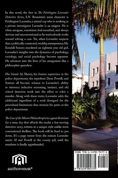 In this novel, the first in The Fairlington Lavender Detective Series, S.N. Bronstein's main character is Fairlington Lavender, a retired cop who is working as a private investigator. Lavender is an enigma. He is often arrogant, sometimes foul mouthed, and always devious and unconventional as he meticulously works toward solving a case. Yet, when Lavender suspects that a politically connected, wealthy, entrepreneur, Mr. Kendall Somers murdered an eighteen year old girl, Lavender's insights into the dynamics of psychology, sociology, and social psychology become apparent. He advances into the lives of his antagonists like a philosopher-gumshoe. His friend Al; Sherry, his former supervisor at the police department; the reprobate Dean Powell; and Somers all become witness to Lavender's ability to intersect inductive reasoning, instinct, and old school detective work into the effort to solve a murder. Along with these traits, Lavender adds the additional ingredient of a total disregard for the procedural limitations that restrain his peers at the police department. The Case of the Miami Philanthropist is a great diversion for a rainy day that affords the reader a fast moving detective story, written in a unique style unlike most conventional thrillers. The book will be hard to put down. It's a page turner from the minute Lavender meets Al and Powell at the county jail, until the murderer is finally apprehended.