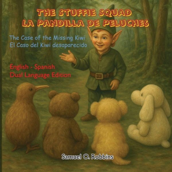 DUAL LANGUAGE English/ Español The Stuffie Squad / The Case of the Missing Kiwi / La Pandilla de Peluches: A heartwarming bilingual English-Spanish picture book for young readers and families. Meet Lambkins, Pookins, Womby, and Kiwi-four best-friend stuffed animals who call themselves the Stuffie Squad. They may look like toys, but they can think, talk, and go on amazing adventures together! When Kiwi suddenly disappears at a busy mall, the friends face their greatest challenge yet. With help from a mysterious woodland elf's riddle, they search high and low, follow every clue, and prove that true friends never give up. Told in parallel English and Spanish text, this gentle and uplifting story helps children build vocabulary in both languages while enjoying an engaging adventure. Perfect for bilingual families, classrooms, and young readers who love mysteries, magic, and tales about courage, friendship, and teamwork. En un apartamento de Washington D. C. viven cuatro animales de peluche: Lambkins, la sabia ovejita; Pookins, el divertido y valiente cockapoodle; Womby, el decidido wombat; y Kiwi, el curioso ave kiwi. Juntos se llaman La Banda de Peluche. Cuando Kiwi desaparece durante una salida con sus amigos Sam y Judy, la Banda de Peluche convierte su miedo en valor. Buscan en cada tienda, piden ayuda y colocan carteles hasta que un misterioso "signo" les conduce a resolver el enigma y traer a su amigo de vuelta. Con ternura, humor y un ritmo ideal para leer en voz alta, esta primera aventura de The Stuffie Squad celebra la amistad, la perseverancia y la magia de una familia que nunca se rinde. Perfecto para niños y niñas a partir de 5 años, este libro invita a conversar sobre el trabajo en equipo, la empatía y la resolución de problemas, con ilustraciones llenas de color y corazón.