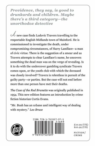 Providence, they say, is good to drunkards and children. Maybe there's a third category-the unorthodox detective. A new case finds Ludovic Travers travelling to the respectable English Midlands town of Mainford. He is commissioned to investigate the death, under compromising circumstances, of Harry Landlace-a man of civic virtue. There is the suggestion of a smear and as Travers attempts to clear Landlace's name, he uncovers something the dead man was on the verge of revealing. Is it to do with the undercover gambling syndicate Travers comes upon, or the youth club with which the deceased was closely involved? Travers is relentless in pursuit of the guilty party-or parties. But the case will not end before more than one person have met their deaths. The Case of the Red Brunette was originally published in 1954. This new edition features an introduction by crime fiction historian Curtis Evans. "Mr. Bush has an urbane and intelligent way of dealing with mystery." Leo Bruce