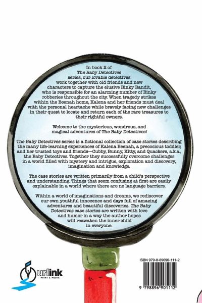 In book 2 of The Baby Detectives series, our lovable detectives work together with old friends and new characters to capture the elusive Binky Bandit, who is responsible for an alarming number of Binky robberies throughout the city. When tragedy strikes within the Beenah home, Kalena and her friends must deal with the personal heartache while bravely facing new challenges in their quest to locate and return each of the rare treasures to their rightful owners. Welcome to the mysterious, wondrous, and magical adventures of The Baby Detectives! The Baby Detectives series is a fictional collection of case stories describing the many life-learning experiences of Kalena Beenah, a precocious toddler, and her trusted toys and friends-Cubby, Bunny, Kitty, and Quackers, a.k.a., the Baby Detectives. Together they successfully overcome challenges in a world filled with mystery and intrigue, exploration and discovery, imagination and knowledge. The case stories are written primarily from a child's perspective and understanding. Things that seem confusing at first are easily explainable in a world where there are no language barriers. Within a world of imaginations and dreams, we rediscover our own youthful innocence and days full of amazing adventures and beautiful discoveries. The Baby Detectives case stories are written with love and humor in a way the author hopes will reawaken the inner child in everyone.