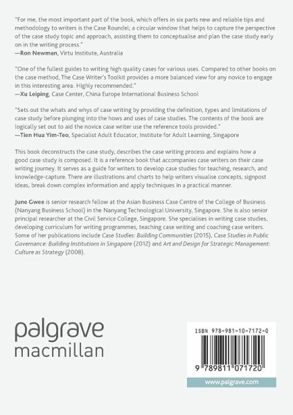 This book deconstructs the case study, describes the case writing process and explains how a good case study is composed. It is a reference book that accompanies case writers on their case writing journey. It serves as a guide for writers to develop case studies for teaching, research, and knowledge-capture. There are illustrations and charts to help writers visualise concepts, signpost ideas, break down complex information and apply techniques in a practical manner.