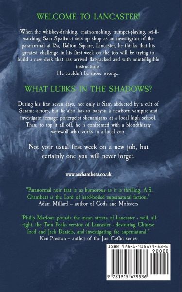 WELCOME TO LANCASTER! When the whiskey-drinking, chain-smoking, trumpet-playing, sci-fi-watching Sam Spallucci sets up shop as an investigator of the paranormal at 15a, Dalton Square, Lancaster, he thinks that his greatest challenge in his first week on the job will be trying to build a new desk that has arrived flat-packed and with unintelligible instructions.He couldn't be more wrong... WHAT LURKS IN THE SHADOWS? During his first seven days, not only is Sam abducted by a cult of Satanic actors, but he also has to babysit a newborn vampire and investigate teenage poltergeist shenanigans at a local high school. Then, to top it all off, he is confronted with a bloodthirsty werewolf who works in a local zoo. Not your usual first week on a new job, but certainly one you will never forget.