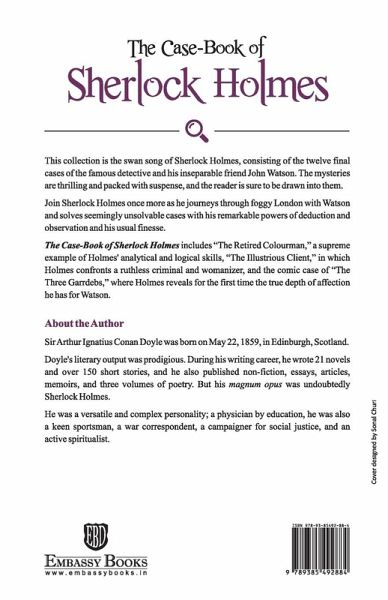 This collection is the swan song of Sherlock Holmes, consisting of the twelve final cases of the famous detective and his inseparable friend John Watson. The mysteries are thrilling and packed with suspense, and the reader is sure to be drawn into them.Join Sherlock Holmes once more as he journeys through foggy London with Watson and solves seemingly unsolvable cases with his remarkable powers of deduction and observation and his usual finesse.The Case-Book of Sherlock Holmes includes ?The Retired Colourman,? a supreme example of Holmes' analytical and logical skills, ?The Illustrious Client,? in which Holmes confronts a ruthless criminal and womanizer, and the comic case of ?The Three Garrdebs,? where Holmes reveals for the first time the true depth of affection he has for Watson.