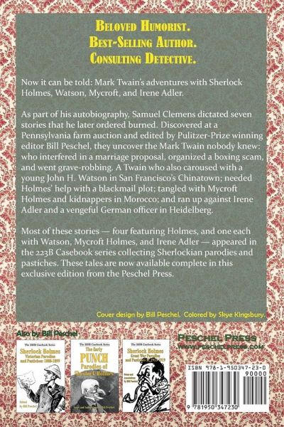 Beloved Humorist. Best-Selling Author. ... Consulting Detective. Now it can be told: Mark Twain's adventures with Sherlock Holmes, Watson, Mycroft, and Irene Adler. As part of his autobiography, Samuel Clemens dictated seven stories that he later ordered burned. Discovered at a Pennsylvania farm auction and edited by Pulitzer-Prize winning editor Bill Peschel, they uncover the Mark Twain nobody knew: who interfered in a marriage proposal, organized a boxing scam, and went grave-robbing. A Twain who also caroused with a young John H. Watson in San Francisco's Chinatown; needed Holmes' help with a blackmail plot; tangled with Mycroft Holmes and kidnappers in Morocco; and ran up against Irene Adler and a vengeful German officer in Heidelberg. Most of these stories - four featuring Holmes, and one each with Watson, Mycroft Holmes, and Irene Adler - appeared in the 223B Casebook series collecting Sherlockian parodies and pastiches. These tales are now available in this exclusive complete edition from the Peschel Press.