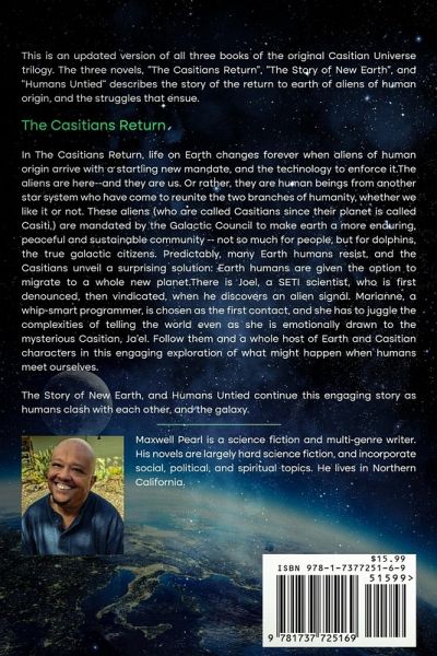 This is an updated version of all three books of the original Casitian Universe trilogy. Casitians Return In The Casitians Return, life on Earth changes forever when aliens of human origin arrive with a startling new mandate, and the technology to enforce it.The aliens are here--and they are us. Or rather, they are human beings from another star system who have come to reunite the two branches of humanity, whether we like it or not. These aliens (who are called Casitians since their planet is called Casiti,) are mandated by the Galactic Council to make earth a more enduring, peaceful and sustainable community -- not so much for people, but for dolphins, the true galactic citizens. Predictably, many Earth humans resist, and the Casitians unveil a surprising solution: Earth humans are given the option to migrate to a whole new planet.There is Joel, a SETI scientist, who is first denounced, then vindicated, when he discovers an alien signal. Marianne, a whip-smart programmer, is chosen as the first contact, and she has to juggle the complexities of telling the world even as she is emotionally drawn to the mysterious Casitian, Ja'el. Follow them and a whole host of Earth and Casitian characters in this engaging exploration of what might happen when humans meet... ourselves. Story of New Earth The Story of New Earth is Volume 2 of the Casitian Universe series. This novel takes off where "The Casitians Return" left off. Many human beings from Earth have settled on a new planet, called "New Earth." This planet is large and verdant, and a wide variety of people have begun to make their home there. Follow the New Americans, led by Gerard, who failed in his attempt to gain the US Presidency during the "Casitian Crisis." Leticia and Beatrice, Marianne's neices, travel far and wide. Humans on Earth and on New Earth learn of a new danger that they must contend with. Marianne comes back to New Earth, humans are put on trial by the Galactic Community, and the Casitians must face the consequences of their actions. Human Untied "Humans Untied" is Volume 3 of the Casitian Universe Trilogy. This novel takes off where "The Story of New Earth" (Volume 2) left off.Things on Earth and New Earth are settling down, but then Terrans are faced with an almost insurmountable task, and are getting no help at first from the Casitians in pulling it off. In addition, things get hairy for humans all over the galaxy, as a new Edict from the Galactic Council means enormous changes in human life, all over the galaxy. Marianne and Ja'el reunite, and help the next generation, including Marianne's neices, with a daunting task: preparing New Earth for massive immigration of Humans from Earth. And they all know that what happens may well determine history for 1000 years.
