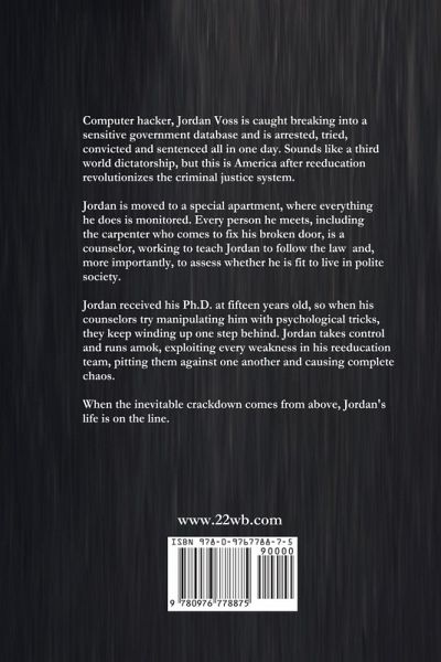 Computer hacker, Jordan Voss is caught breaking into a sensitive government database and is arrested, tried, convicted and sentenced all in one day. Sounds like a third world dictatorship, but this is America after reeducation revolutionizes the criminal justice system. Jordan is moved to a special apartment where everything he does is monitored. Every person he meets, including the carpenter who comes to fix his broken door, is a counselor, working to teach Jordan to follow the law and, more importantly, to assess whether he is fit to live in polite society. Jordan received his Ph.D. at fifteen years old, so when his counselors try manipulating him with psychological ploys, they keep winding up one step behind. Jordan takes control and runs amok, exploiting every weakness in his reeducation team, pitting them against one another and causing complete chaos. When the inevitable crackdown comes from above, Jordan's life is on the line.