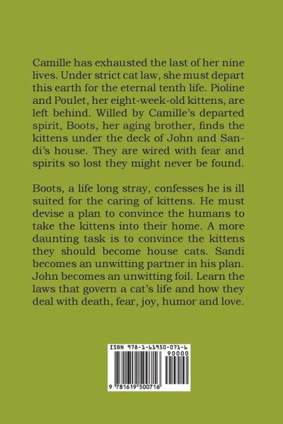 Camille has exhausted the last of her nine lives. Under strict cat law, she must depart this earth for the eternal tenth life. Pioline and Poulet, her eight-week-old kittens, are left behind. Willed by Camille's departed spirit, Boots, her aging brother, finds the kittens under the deck of John and Sandi's house. They are wired with fear and spirits so lost they might never be found. Boots, a life long stray, confesses he is ill suited for the caring of kittens. He must devise a plan to convince the humans to take the kittens into their home. A more daunting task is to convince the kittens they should become house cats. Sandi becomes an unwitting partner in his plan. John becomes an unwitting foil. Learn the laws that govern a cat's life and how they deal with death, fear, joy, humor and love.