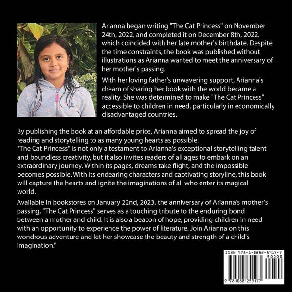 A beautiful story written by 7 years old Arianna Thapaliya in memory of her Mom! In an incredible display of talent and dedication, seven-year-old author Arianna crafted the captivating story of May the Cat's Enthralling World in just three weeks, primarily during weekends. Her commitment and passion for writing allowed her to bring this imaginative tale to life in a remarkably short span of time. With minimal grammar and word edits, the story remains true to Arianna's original vision, preserving the authenticity and creativity that flows from the mind of a young prodigy. Arianna's literary accomplishment showcases her extraordinary abilities and sets her apart as a rising star in the world of storytelling. The depth and complexity of her narrative, coupled with her vivid imagination, make May the Cat's Enthralling World a standout work that will captivate readers of all ages. As readers journey through the pages of this enchanting book, they will be transported to a realm where courage, magic, and adventure intertwine. May's transformation into a cat by her malevolent uncle, Dava, sets the stage for a gripping tale of resilience, friendship, and the battle between good and evil. With each turn of the page, Arianna's storytelling prowess will captivate the reader, immersing them in a world where hope prevails even in the darkest of times. This remarkable achievement is a testament to Arianna's talent, determination, and the inspiration she draws from her teacher and the memory of her late mother. May the Cat's Enthralling World serves as a testament to the power of storytelling and reminds us that age is no barrier to creating extraordinary works of art. Experience the wonder and excitement of Arianna's literary debut as she invites readers into a world brimming with spellbinding magic, daring adventures, and unforgettable characters. This remarkable book is not only a treasure to be cherished on every child's bookshelf but also a testament to the limitless potential of young minds. Join May and her friends on an extraordinary journey as they defy the odds, overcome challenges, and embrace the true essence of heroism. Embark on this extraordinary literary adventure, where the talent and imagination of a seven-year-old author shine brightly, leaving readers spellbound and eager for more. May the Cat's Enthralling World is a literary gem that will forever leave its mark on the hearts and imaginations of all who delve into its pages.