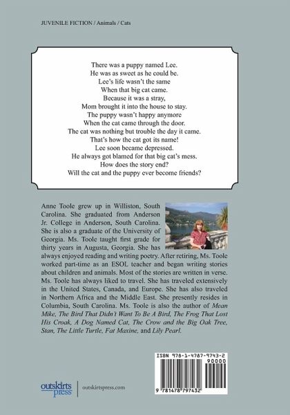 There was a puppy named Lee. He was as sweet as he could be. Lee's life wasn't the same When that big cat came. Because it was a stray, Mom brought it into the house to stay. The puppy wasn't happy anymore When the cat came through the door. The cat was nothing but trouble the day it came. That's how the cat got its name! Lee soon became depressed. He always got blamed for that big cat's mess. How does the story end? Will the cat and the puppy ever become friends?