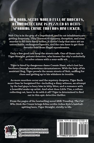 In a dark, seedy world full of bad cats, a lone detective is puzzled by a city-spanning crime that has him licked. Nub City is in the grip of a Depression, and its cat inhabitants are getting desperate. They'll resort to thievery, deception, and even murder to fill their furry bellies. It doesn't help that mice are an untouchable, endangered species, and the cats have to get their favorite food from illegal squeakeasies. Only a few good cats keep the streets safe. One of those cats is Tiger Straight, private detective, who braves the city's underbelly to solve crimes with a sour-milk wit. Tiger is hired by dangerous dame Connie Hant, who's lost her brothers through mysterious circumstances. With the help of his assistant Bug, Tiger prowls the mean streets of Nub, sniffing for clues and getting up to his whiskers in trouble. As more murders occur and the mystery deepens, Tiger finds more than he bargained for-including a dizzy witness, an attempt by the bad guys to bury him in kitty litter, and a romance with a beautiful make-up artist. And what does Little Tim, a refuse-collecting cat, have to do with it all? Tiger is determined to find out in this epic detective thriller. From the pages of the bestselling novel Milk Treading, The Cat Who Stole the Cream brings feline scribe Julius Kyle's hairball-spitting hero, Tiger Straight, vividly to life.