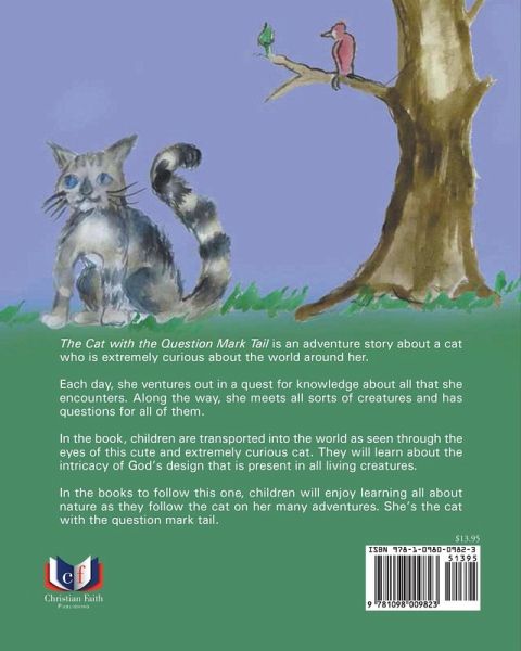 The Cat with the Question Mark Tail is an adventure story about a cat who is extremely curious about the world around her. Each day, she ventures out in a quest for knowledge about all that she encounters. Along the way, she meets all sorts of creatures and has questions for all of them. In the book, children are transported into the world as seen through the eyes of this cute and extremely curious cat. They will learn about the intricacy of God's design that is present in all living creatures. In the books to follow this one, children will enjoy learning all about nature as they follow the cat on her many adventures. She's the cat with the question mark tail.