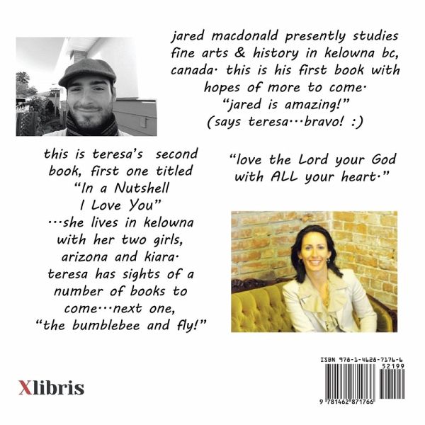 jared macdonald presently studies fine arts and history in Kelowna bc, Canada. This is his first book with hopes of more to come. "jared is amazing!" (says teresa...bravo! :) "love the Lord your God with ALL your heart." This is teresa's second book, first one entitled "In a Nutshell I love You" ...she lives in kelowna with her two girls, arizona and kiara. teresa has sights of a number of books to come...next one, "the bumblebee and fly!"