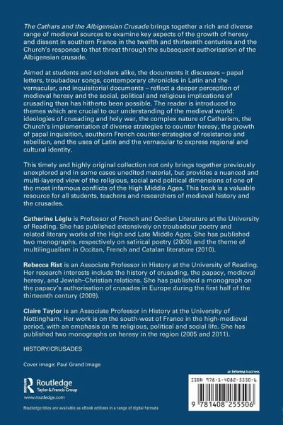 Catherine Léglu is Professor of French and Occitan Literature at the University of Reading. She has published extensively on troubadour poetry and related literary works of the High and Late Middle Ages. She has published two monographs, respectively on satirical poetry (2000) and the theme of multilingualism in Occitan, French and Catalan literature (2010). Rebecca Rist is an Associate Professor in History at the University of Reading. Her research interests include the history of crusading, the papacy, medieval heresy, and Jewish-Christian relations. She has published a monograph on the papacy's authorisation of crusades in Europe during the first half of the thirteenth century (2009). Claire Taylor is an Associate Professor in History at the University of Nottingham. Her work is on the south-west of France in the high-medieval period, with an emphasis on its religious, political and social life. She has published two monographs on heresy in the region (2005 and 2011).