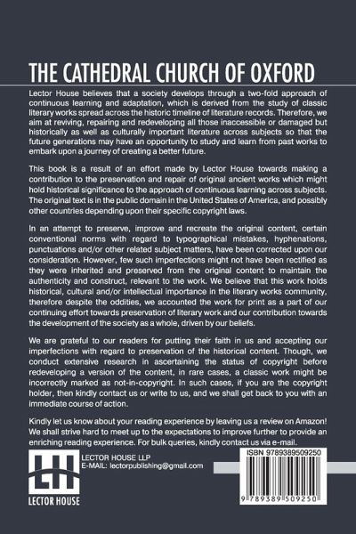 The Cathedral Church Of Oxford: A Description Of Its Fabric And A Brief History Of The Episcopal See This book is a result of an effort made by us towards making a contribution to the preservation and repair of original classic literature. In an attempt to preserve, improve and recreate the original content, we have worked towards: 1. Type-setting & Reformatting: The complete work has been re-designed via professional layout, formatting and type-setting tools to re-create the same edition with rich typography, graphics, high quality images, and table elements, giving our readers the feel of holding a 'fresh and newly' reprinted and/or revised edition, as opposed to other scanned & printed (Optical Character Recognition - OCR) reproductions. 2. Correction of imperfections: As the work was re-created from the scratch, therefore, it was vetted to rectify certain conventional norms with regard to typographical mistakes, hyphenations, punctuations, blurred images, missing content/pages, and/or other related subject matters, upon our consideration. Every attempt was made to rectify the imperfections related to omitted constructs in the original edition via other references. However, a few of such imperfections which could not be rectified due to intentional\unintentional omission of content in the original edition, were inherited and preserved from the original work to maintain the authenticity and construct, relevant to the work. We believe that this work holds historical, cultural and/or intellectual importance in the literary works community, therefore despite the oddities, we accounted the work for print as a part of our continuing effort towards preservation of literary work and our contribution towards the development of the society as a whole, driven by our beliefs. We are grateful to our readers for putting their faith in us and accepting our imperfections with regard to preservation of the historical content. HAPPY READING!