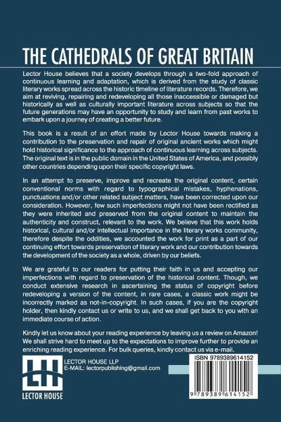 The Cathedrals Of Great Britain: Their History And Architecture This book is a result of an effort made by us towards making a contribution to the preservation and repair of original classic literature. In an attempt to preserve, improve and recreate the original content, we have worked towards: 1. Type-setting & Reformatting: The complete work has been re-designed via professional layout, formatting and type-setting tools to re-create the same edition with rich typography, graphics, high quality images, and table elements, giving our readers the feel of holding a 'fresh and newly' reprinted and/or revised edition, as opposed to other scanned & printed (Optical Character Recognition - OCR) reproductions. 2. Correction of imperfections: As the work was re-created from the scratch, therefore, it was vetted to rectify certain conventional norms with regard to typographical mistakes, hyphenations, punctuations, blurred images, missing content/pages, and/or other related subject matters, upon our consideration. Every attempt was made to rectify the imperfections related to omitted constructs in the original edition via other references. However, a few of such imperfections which could not be rectified due to intentional\unintentional omission of content in the original edition, were inherited and preserved from the original work to maintain the authenticity and construct, relevant to the work. We believe that this work holds historical, cultural and/or intellectual importance in the literary works community, therefore despite the oddities, we accounted the work for print as a part of our continuing effort towards preservation of literary work and our contribution towards the development of the society as a whole, driven by our beliefs. We are grateful to our readers for putting their faith in us and accepting our imperfections with regard to preservation of the historical content. HAPPY READING!