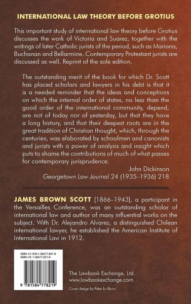 INTERNATIONAL LAW THEORY BEFORE GROTIUS Originally published: Washington, D.C.: Georgetown University Press, 1934. xxix (v-xxix new introduction), XV, [2], 494 pp. This important study of international law theory before Grotius discusses the work of Victoria and Suarez, together with the writings of later Catholic jurists of the period, such as Mariana, Buchanan and Bellarmine. Contemporary Protestant jurists are discussed as well. Reprint of the sole edition. "The outstanding merit of the book for which Dr. Scott has placed scholars and lawyers in his debt is that it is a needed reminder that the ideas and conceptions on which the internal order of states, no less than the good order of the international community, depend, are not of today nor of yesterday, but that they have a long history, and that their deepest roots are in the great tradition of Christian thought, which, through the centuries, was elaborated by schoolmen and canonists and jurists with a power of analysis and insight which puts to shame the contributions of much of what passes for contemporary jurisprudence."--John Dickinson, Georgetown Law Journal 24 (1935-1936) 218 JAMES BROWN SCOTT [1866-1943], a participant in the Versailles Conference, was an outstanding scholar of international law and author of many influential works on the subject. With Dr. Alejandro Alvarez, a distinguished Chilean international lawyer, he established the American Institute of International Law in 1912.