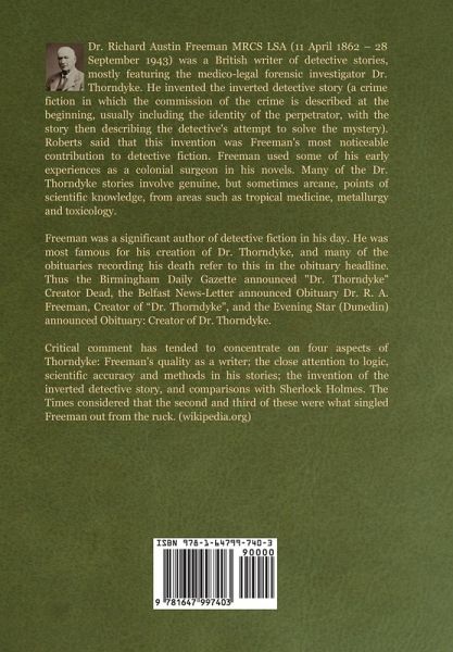 Dr. Richard Austin Freeman MRCS LSA (11 April 1862 - 28 September 1943) was a British writer of detective stories, mostly featuring the medico-legal forensic investigator Dr. Thorndyke. He invented the inverted detective story (a crime fiction in which the commission of the crime is described at the beginning, usually including the identity of the perpetrator, with the story then describing the detective's attempt to solve the mystery). Roberts said that this invention was Freeman's most noticeable contribution to detective fiction. Freeman used some of his early experiences as a colonial surgeon in his novels. Many of the Dr. Thorndyke stories involve genuine, but sometimes arcane, points of scientific knowledge, from areas such as tropical medicine, metallurgy and toxicology. Freeman was a significant author of detective fiction in his day. He was most famous for his creation of Dr. Thorndyke, and many of the obituaries recording his death refer to this in the obituary headline. Thus the Birmingham Daily Gazette announced "Dr. Thorndyke" Creator Dead, the Belfast News-Letter announced Obituary Dr. R. A. Freeman, Creator of "Dr. Thorndyke", and the Evening Star (Dunedin) announced Obituary: Creator of Dr. Thorndyke. Critical comment has tended to concentrate on four aspects of Thorndyke: Freeman's quality as a writer; the close attention to logic, scientific accuracy and methods in his stories; the invention of the inverted detective story, and comparisons with Sherlock Holmes. The Times considered that the second and third of these were what singled Freeman out from the ruck. (wikipedia.org)