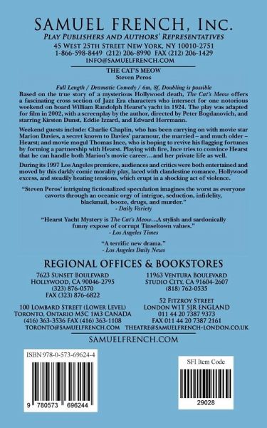 Full Length, Comic Drama / 6 m, 8 f, Doubling is possible. Based on the true story of a mysterious Hollywood death, The Cat's Meow offers a fascinating cross section of Jazz Era characters who intersect for one notorious weekend on board William Randolph Hearst's yacht in 1924. The play was adapted for film in 2002, with a screenplay by the author, directed by Peter Bogdanovich, and starring Kirsten Dunst, Eddie Izzard, and Edward Herrmann. Weekend guests include: Charlie Chaplin, who has been