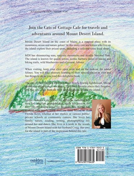 Join the Cats of Cottage Cafe for travels and adventures around Mount Desert Island. Mount Desert Island on the coast of Maine is a magical place with its mountains, ocean and nature galore! In this story, cats and kitties who live on the island explore their prized spots, including a cafe and some local shops. MDI has shimmering seas, majestic mountains and Acadia National Park. The island is known for quaint towns, scenic harbors, miles of hiking and biking trails, wild blueberries and of course, lobster. When visiting, keep your eyes open wide and on the lookout for island felines. You will take pleasure learning of their special places to visit and fun things to do as you read this delightful book. The cats of the Cottage Cafe enjoy Sand Beach, touring lighthouses, hiking mountains and visiting town parks. They have favorite places they frequent, just like you. Join them on their fun adventures around the island.