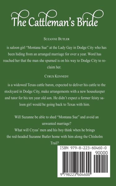 Suzanne Butler is saloon girl "Montana Sue" at the Lady Gay in Dodge City who has been hiding from an arranged marriage for over a year. Word has reached her that the man she spurned is on his way to Dodge City to reclaim her. Cyrus Kennedy is a widowed Texas cattle baron, expected to deliver his cattle to the stockyard in Dodge City, make arrangements with a new housekeeper and tutor for his ten-year-old son. He didn't expect a former feisty saloon girl would be going back to Texas with him. Will Suzanne be able to shed "Montana Sue" and avoid an unwanted marriage? What will Cryus' men and his boy think when he brings the red-headed Suzanne Butler home with him along the Chisholm Trail?