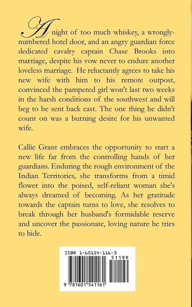 A night of too much whiskey, a wrongly-numbered hotel door, and an angry guardian force dedicated cavalry captain Chase Brooks into marriage, despite his vow never to endure another loveless marriage. He reluctantly agrees to take his new wife with him to his remote outpost, convinced the pampered girl won't last two weeks in the harsh conditions of the southwest and will beg to be sent back east. The one thing he didn't count on was a burning desire for his unwanted wife. Callie Grant embraces the opportunity to start a new life far from the controlling hands of her guardians. Enduring the rough environment of the Indian Territories, she transforms from a timid flower into the poised, self-reliant woman she's always dreamed of becoming. As her gratitude towards the captain turns to love, she resolves to break through her husband's formidable reserve and uncover the passionate, loving nature he tries to hide.