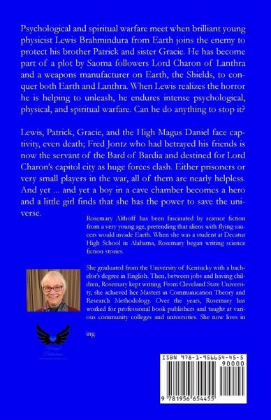 Psychological and spiritual warfare meet when brilliant young physicist Lewis Brahmindura from Earth joins the enemy to protect his brother Patrick and sister Gracie. He has become part of a plot by Saoma followers Lord Charon of Lanthra and a weapons manufacturer on Earth, the Shields, to conquer both Earth and Lanthra. When Lewis realizes the horror he is helping to unleash, he endures intense psychological, physical, and spiritual warfare. Can he do anything to stop it? Lewis, Patrick, Gracie, and the High Magus Daniel face captivity, even death; Fred Jontz who had betrayed his friends is now the servant of the Bard of Bardia and destined for Lord Charon's capitol city as huge forces clash. Either prisoners or very small players in the war, all of them are nearly helpless. And yet ... and yet a boy in a cave chamber becomes a hero and a little girl finds that she has the power to save the universe.