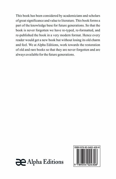 This book has been considered by academicians and scholars of great significance and value to literature. This book forms a part of the knowledge base for future generations. So that the book is never forgotten we have re-typed, re-formatted, and re-published the book in a very modern format. Hence every reader would get a new book but without losing its old charm and feel. We at Alpha Editions, work towards the restoration of old and rare books so that they are never forgotten and are always available for the future generations.