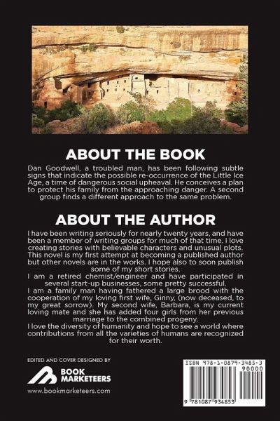 About the Book Dan Goodwell, a troubled man, has been following subtle signs that indicate the possible re-occurrence of the Little Ice Age, a time of dangerous social upheaval. He conceives a plan to protect his family from the approaching danger. A second group finds a different approach to the same problem. About the Author I have been writing seriously for nearly twenty years, and have been a member of writing groups for much of that time. I love creating stories with believable characters and unusual plots. This novel is my first attempt at becoming a published author but other novels are in the works. I hope also to soon publish some of my short stories. I am a retired chemist/engineer and have participated in several start-up businesses, some pretty successful. I am a family man having fathered a large brood with the cooperation of my loving first wife, Ginny, (now deceased, to my great sorrow). My second wife, Barbara, is my current loving mate and she has added four girls from her previous marriage to the combined progeny. I love the diversity of humanity and hope to see a world where contributions from all the varieties of humans are recognized for their worth.