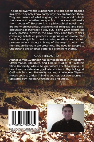This book involves the experiences of eight people trapped in a cave. They only know partly why they are trapped there. They are unsure of what is going on in the world outside the cave and whether escape from the cave will make them better off. Because it is a philosophical novel, there are many philosophical, psychological, religious, and social discussions as they seek a way out. Facing what seems like a very possible death in the cave, they each turn to their consoling beliefs or practices, religious or otherwise. The book is susceptible to various interpretations and should provoke serious thought. Many of the ways in which we humans are ignorant are presented. The need for people to understand one another better is a prominent theme. About the Author Author James S. Johnson has earned degrees in Philosophy, Mathematics, Literature, and Liberal Studies at California State University, where he graduated Phi Beta Kappa. He has done considerable graduate studies in Psychology at California Southern University. He taught college for 15 years, mostly Logic & Critical Thinking courses, but also courses in Epistemology, Religion, Humanities, and Ethics.