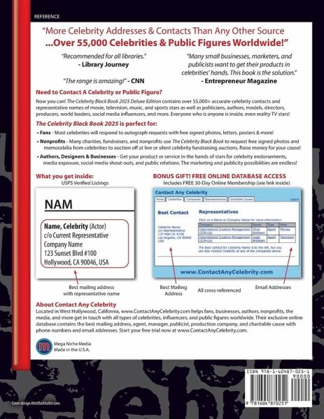 The Celebrity Black Book 2025 (Deluxe Edition): Over 50,000+ Verified Celebrity Addresses for Autographs, Fundraising, Celebrity Endorsements, Marketing, Publicity & More! Includes a FREE 30-Day Test Drive to ContactAnyCelebrity.com ($39.00 Value) Inside "The Celebrity Black Book 2025," you'll discover the verified mailing addresses of over 50,000 celebrities, influencers, and public figures worldwide. Everyone who is anyone: * Movie & TV Stars * Musicians * Athletes * Reality Stars * Politicians * World Leaders * Authors & Writers * Directors & Producers * Plus Many More! "The Celebrity Black Book" is a staple for fans who want autographs; charities and nonprofits who want to raise money for their cause; entrepreneurs and marketers who want celebrity endorsements and free publicity for their producers/services; authors who want blurbs for their books; and journalists/media who want quotes and interviews. There are so many uses -- the possibilities are endless! Look what people are saying: "The range is amazing - this thing is huge!" - CNN "Many small businesses, publicists, and marketers want to get their products into celebrities' hands. This book is the solution." - Entrepreneur Magazine "Similar titles do not boast as many entries. If your library needs a current celebrity address book, this would be good. Recommended for all libraries." - Library Journal "Of all the resources for celebrity addresses, this book is far and away the most useful. It is essential for any serious autograph collector. Indispensable!" - Autograph Magazine "A superb, quick, and easy-to-use reference for entertainment professionals and fans alike." - Midwest Book Review "This guide offers priceless information that would otherwise take hours to research. Owning this book is like cutting six degrees of separation down to one simple degree." - Curled Up With A Good Book "The time saved by already having the celebrity's contact information rather than Googling and cold-calling will certainly pay for this book in the long run." - Absolute Write "Some of the best money you'll ever spend. This book is an excellent value and provides you (and me) with great publicity opportunities." - Paul Hartunian, Free Publicity Information Center "The most helpful book I have ever owned. Worth every penny." - Jill Jackson, Syndicated Columnist, Jill Jackson's Hollywood "If you opt to pursue a celebrity or celebrities on your own or to use in your advertising, or to get a 'blurb' for your book, this is the place to get contact information." - Dan Kennedy, No B.S. Guide to Marketing to the Affluent * Visit ContactAnyCelebrity.com for more testimonials and success stories!