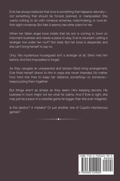 Evie has always believed that love is something that happens naturally-not something that should be forced, planned, or manipulated. She wants nothing to do with romance schemes, matchmaking, or love-at-first-sight nonsense. But fate, it seems, has other plans for her. When her fallen angel boss insists that his son is coming to town on important business and needs a place to stay, Evie is reluctant. Letting a stranger live under her roof? Not ideal. But her boss is desperate, and she can't bring herself to say no. Only, this mysterious houseguest isn't a stranger at all. She's met him before. And he's impossible to forget. As they navigate an unexpected and tension-filled living arrangement, Evie finds herself drawn to him in ways she never intended. No matter how hard she tries to keep her distance, something-or someone-keeps pulling them together. But things aren't as simple as they seem. He's keeping secrets. His business in town might not be what he claims. And if Evie is right, she may just be a pawn in a celestial game far bigger than she ever imagined. Is this destiny? A mistake? Or just another one of Cupid's mischievous games? A romantic fantasy full of mystery, forbidden attraction, and otherworldly forces, where love is more than just an emotion-it's fate.
