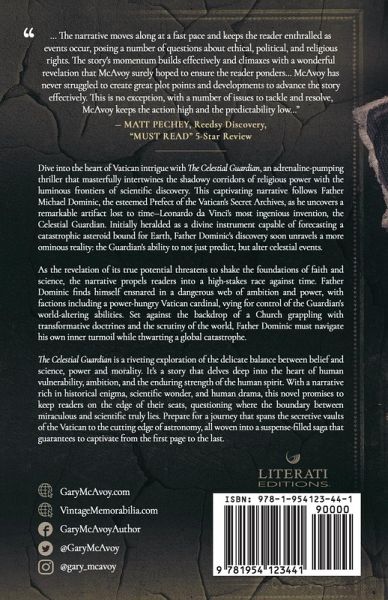 Dive into the heart of Vatican intrigue with "The Celestial Guardian," an adrenaline-pumping thriller that masterfully intertwines the shadowy corridors of religious power with the luminous frontiers of scientific discovery. This captivating narrative follows Father Michael Dominic, the esteemed Prefect of the Vatican's Secret Archives, as he uncovers a remarkable artifact lost to time-Leonardo da Vinci's most ingenious invention, the Celestial Guardian. Initially heralded as a divine instrument capable of forecasting a catastrophic asteroid bound for Earth, Father Dominic's discovery soon unravels a more ominous reality: the Guardian's ability to not just predict, but alter celestial events. As the revelation of its true potential threatens to shake the foundations of faith and science, the narrative propels readers into a high-stakes race against time. Father Dominic finds himself ensnared in a dangerous web of ambition and power, with factions including a power-hungry Vatican cardinal, vying for control of the Guardian's world-altering abilities. Set against the backdrop of a Church grappling with transformative doctrines and the scrutiny of the world, Father Dominic must navigate his own inner turmoil while thwarting a global catastrophe. "The Celestial Guardian" is a riveting exploration of the delicate balance between belief and science, power and morality. It's a story that delves deep into the heart of human vulnerability, ambition, and the enduring strength of the human spirit. With a narrative rich in historical enigma, scientific wonder, and human drama, this novel promises to keep readers on the edge of their seats, questioning where the boundary between miraculous and scientific truly lies. Prepare for a journey that spans the secretive vaults of the Vatican to the cutting edge of astronomy, all woven into a suspense-filled saga that guarantees to captivate from the first page to the last.
