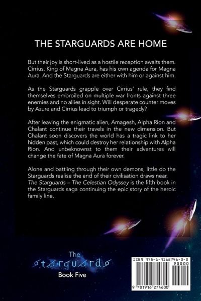 The Starguards are home. But their joy is short-lived as a hostile reception awaits them. Cirrius, King of Magna Aura, has his own agenda for Magna Aura. And the Starguards are either with him or against him. As the Starguards grapple over Cirrius' rule, they find themselves embroiled on multiple war fronts against three enemies and no allies in sight. Will desperate counter moves by Azure and Cirrius lead to triumph or tragedy? After leaving the enigmatic alien, Amagesh, Alpha Rion and Chalant continue their travels in the new dimension. But Chalant soon discovers the world has a tragic link to her hidden past, which could destroy her relationship with Alpha Rion. And unbeknownst to them their adventures will change the fate of Magna Aura forever. Alone and battling through their own demons, little do the Starguards realise the end of their civilisation draws near. The Starguards - The Celestian Odyssey is the fifth book in the Starguards saga continuing the epic story of the heroic family line.