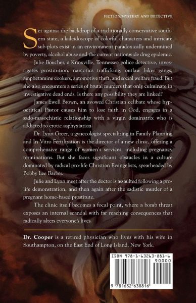 Set against the backdrop of a traditionally conservative South, a kaleidoscope of colorful characters and intricate sub-plots exist in an environment, paradoxically undermined by poverty, alcohol abuse and the current nationwide drug epidemic. Julie Boucher, a Knoxville, Tennessee police detective, investigates prostitution, narcotics trafficking, outlaw biker gangs, amphetamine cookers, automotive theft, and social welfare fraud. But she also encounters a series of brutal murders that only culminate in investigative dead ends. Is there any possibility they are linked? James Ewell Brown, an avowed Christian celibate whose hypocritical Pastor causes him to lose faith in God, engages in a relationship with a virgin dominatrix. Dr. Lynn Greer, a gynecologist specializing in Family Planning and In Vitro Fertilization is the director of a new clinic, offering a comprehensive range of women's services, including pregnancy terminations. But she faces significant obstacles in a culture dominated by radical pro-life Christian Evangelists. Julie and Lynn meet after the doctor is assaulted following a pro-life demonstration, and then again after the sadistic murder of a pregnant home-based prostitute. The clinic itself becomes a focal point, where a bomb threat exposes an internal scandal with far reaching consequences that radically alters everyone’s lives.