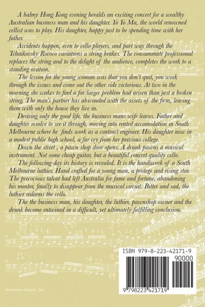 A thousand hearts stopped beating. The orchestra grinds to a halt. A furtive glance, and with a shake of the head to the conductor the cello soloist walks off the stage. A young woman looks at her father, "What is happening dad?" "All will be well Georgia," he turns to answer, "it's just a broken string." And so begins our story. Played out not under the bright lights of the Hong Kong stage but in a modest life in South Melbourne, where a young, if reluctant gifted musician rises above the impact of her father's business and family collapse. Bonds are formed between an old luthier; a failed concert cellist now turned teacher to the girl, the girl, and an unwanted cello, which steadfastly refuses to play works by the old masters, notably J. S. Bach. Joining a local orchestra, her section leader sees within her a great potential. She premiers the work of a young composer to wide acclaim only to see her career hopes dashed in a disastrous national radio interview when she refuses to play Bach. When her teacher does not turn up for a lesson, her insensitivity at his no show is severely chastened by the pawnshop owner who knows more of the story. His friends rally; the cancer now in remission, his teaching lifts her playing to where now they consider a career as a professional cellist. His plan is to subtly modify the timing of the Bach second suite she has to play, he hopes, by breaking accepted norms she will startle the judges into favourably considering her application. Days before the university entrance performance her teacher's illness returns and he's rushed to hospital where the prognosis is poor. The hospital informs the luthier of his old protege's death on the day of the recital, he cannot risk her knowing and remains silent in his grief. During the performance, Georgia looks into the old man's tear filled eyes and knows David has died. In an act of love and faith she attempts the Bach on her dead teacher's instrument. Horrified, her father sees her walk onto the stage with the cello but it is too late, she sits and plays.