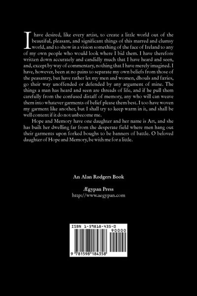I have desired, like every artist, to create a little world out of the beautiful, pleasant, and significant things of this marred and clumsy world and to show in a vision something of the face of Ireland to any of my own people who would look where I bid them. I have therefore written down accurately and candidly much that I have heard and seen, and, except by way of commentary, nothing that I have merely imagined. I have, however, been at no pains to separate my own beliefs from those of the peasantry, but have rather let my men and women, ghouls and færies, go their way unoffended or defended by any argument of mine. The things a man has heard and seen are threads of life, and if he pull them carefully from the confused distaff of memory, any who will can weave them into whatever garments of belief please them best. I too have woven my garment like another, but I shall try to keep warm in it, and shall be well content if it do not unbecome me. Hope and Memory have one daughter and her name is Art and she has built her dwelling far from the desperate field where men hang out their garments upon forked boughs to be banners of battle. O beloved daughter of Hope and Memory, be with me for a little. -- W.B. Yeats