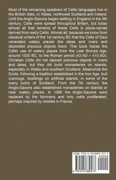 Most of the remaining speakers of Celtic languages live in the British Isles, in Wales, northwest Scotland and Ireland. Until the Anglo-Saxons began settling in England in the 5th century, Celts were spread throughout Britain, but today almost all that remains of these Celts is place-names derived from early Celtic. Almost all, because we know from classical writers of the 1st century BC that the Celts of Gaul venerated watery places like lakes and rivers and deposited precious objects there. This book traces the Celtic use of watery places from the Late Bronze Age, around 1000 BC, to the Roman period (43 AD - 410 AD). Christian Celts did not deposit precious objects in rivers and lakes, but they did build monasteries on islands, especially in Wales and southern Scotland. Meanwhile the Scots, following a tradition established in the Iron Age, buit crannogs, dwellings on artificial islands, in some of the many lochs of Scotland. From the 7th century the Anglo-Saxons also established monasteries on islands or near watery places. In 1066 the Anglo-Saxons were replaced by the Normans and holy wells proliferated, perhaps inspired by models in France.
