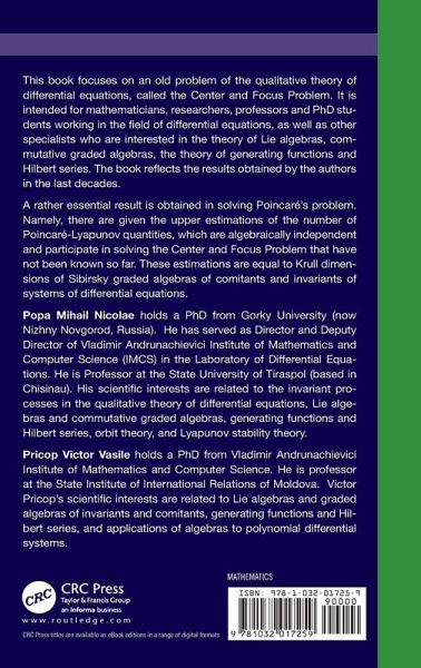 The Center and Focus Problem: Algebraic Solutions and Hypotheses, M. N. Popa and V.V. Pricop, ISBN: 978-1-032-01725-9 (Hardback) This book focuses on an old problem of the qualitative theory of differential equations, called the Center and Focus Problem. It is intended for mathematicians, researchers, professors and Ph.D. students working in the field of differential equations, as well as other specialists who are interested in the theory of Lie algebras, commutative graded algebras, the theory of generating functions and Hilbert series. The book reflects the results obtained by the authors in the last decades. A rather essential result is obtained in solving Poincaré's problem. Namely, there are given the upper estimations of the number of Poincaré-Lyapunov quantities, which are algebraically independent and participate in solving the Center and Focus Problem that have not been known so far. These estimations are equal to Krull dimensions of Sibirsky graded algebras of comitants and invariants of systems of differential equations.