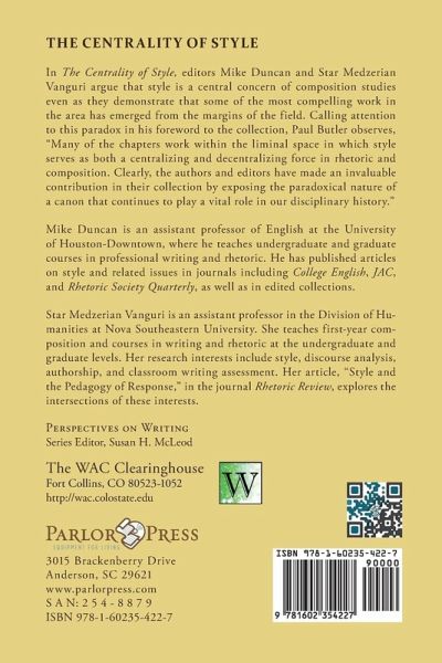 PERSPECTIVES ON WRITING: Series Editor, Susan H. McLeod Foreword by PAUL BUTLER In THE CENTRALITY OF STYLE, editors Mike Duncan and Star Medzerian Vanguri argue that style is a central concern of composition studies even as they demonstrate that some of the most compelling work in the area has emerged from the margins of the field. Calling attention to this paradox in his foreword to the collection, Paul Butler observes, "Many of the chapters work within the liminal space in which style serves as both a centralizing and decentralizing force in rhetoric and composition. Clearly, the authors and editors have made an invaluable contribution in their collection by exposing the paradoxical nature of a canon that continues to play a vital role in our disciplinary history." CONTRIBUTORS include Nora Bacon, Jonathan Buehl, Paul Butler, Rosanne Carlo, Mike Duncan, Erik Ellis, William FitzGerald, Crystal Fodrey, Moe Folk, Russell Greer, Chris Holcomb, M. Jimmie Killingsworth, William C. Kurlinkus, Zak Lancaster, Tom Pace, Luke Redington, Keith Rhodes, Denise Stodola, and Star Medzerian Vanguri. MIKE DUNCAN is an assistant professor of English at the University of Houston-Downtown, where he teaches undergraduate and graduate courses in professional writing and rhetoric. He has published articles on style and related issues in journals including College English, JAC, and Rhetoric Society Quarterly, as well as in edited collections. STAR MEDZERIAN VANGURI is an assistant professor in the Division of Humanities at Nova Southeastern University. She teaches first-year composition and courses in writing and rhetoric at the undergraduate and graduate levels. Her research interests include style, discourse analysis, authorship, and classroom writing assessment. Her article, "Style and the Pedagogy of Response," in the journal Rhetoric Review, explores the intersections of these interests.