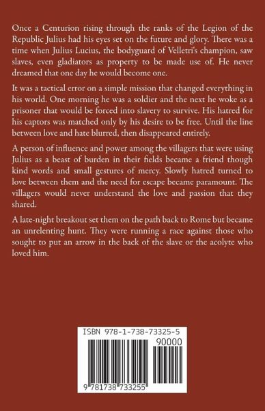 Once a Centurion rising through the ranks of the Legion of the Republic Julius had his eyes set on the future and glory. There was a time when Julius Lucius, the bodyguard of Velletri's champion, saw slaves, even gladiators as property to be made use of. He never dreamed that one day he would become one. It was a tactical error on a simple mission that changed everything in his world. One morning he was a soldier and the next he woke as a prisoner that would be forced into slavery to survive. His hatred for his captors was matched only by his desire to be free. Until the line between love and hate blurred, then disappeared entirely. A person of influence and power among the villagers that were using Julius as a beast of burden in their fields became a friend though kind words and small gestures of mercy. Slowly hatred turned to love between them and the need for escape became paramount. The villagers would never understand the love and passion that they shared. A late-night breakout set them on the path back to Rome but became an unrelenting hunt. They were running a race against those who sought to put an arrow in the back of the slave or the acolyte who loved him.